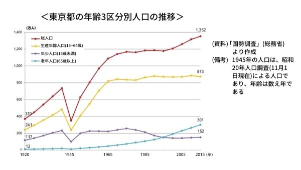 一見、右肩上がりに上昇してるように見える人口ですが、15歳未満と65歳以上の人口が逆転しています。